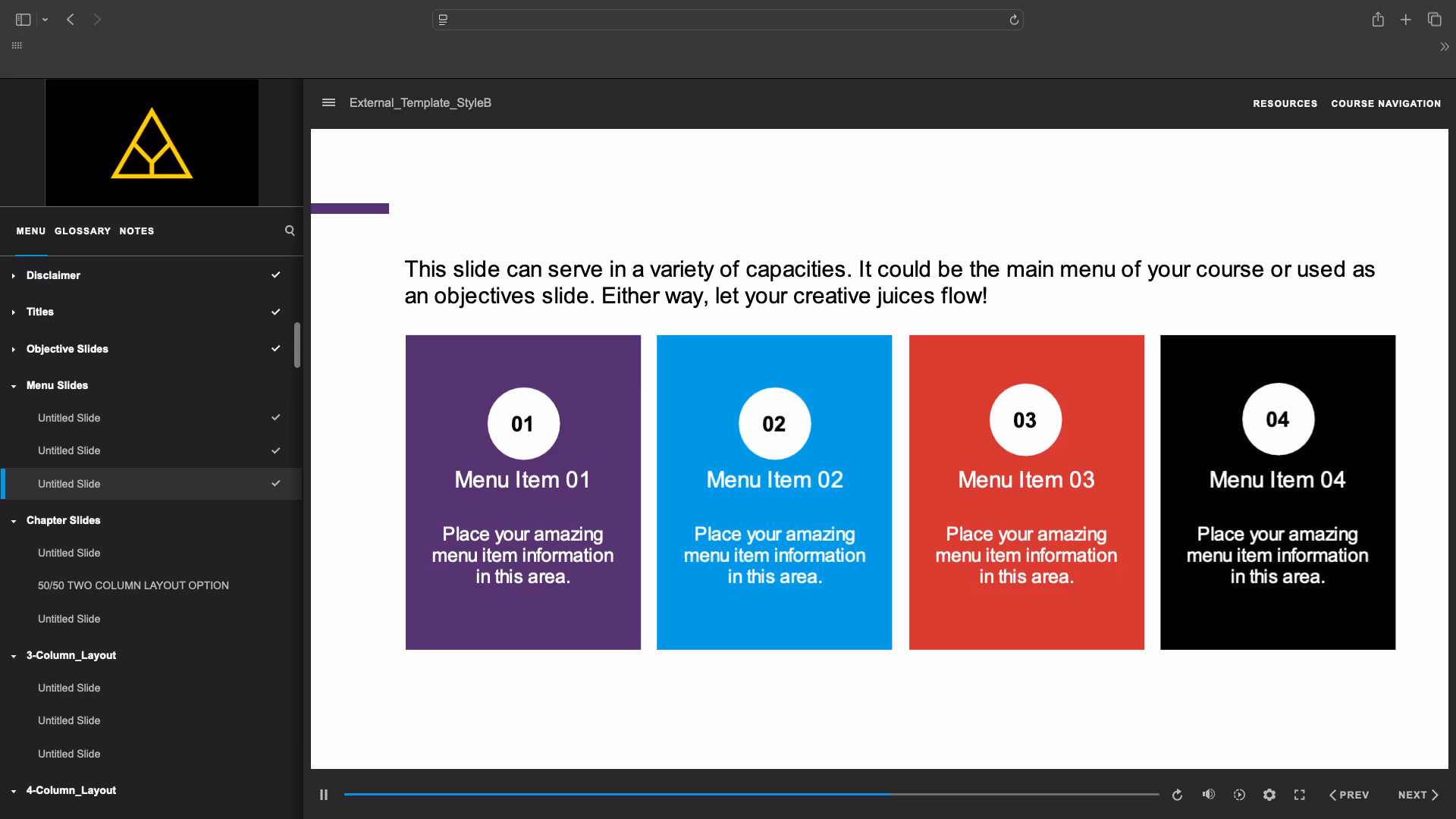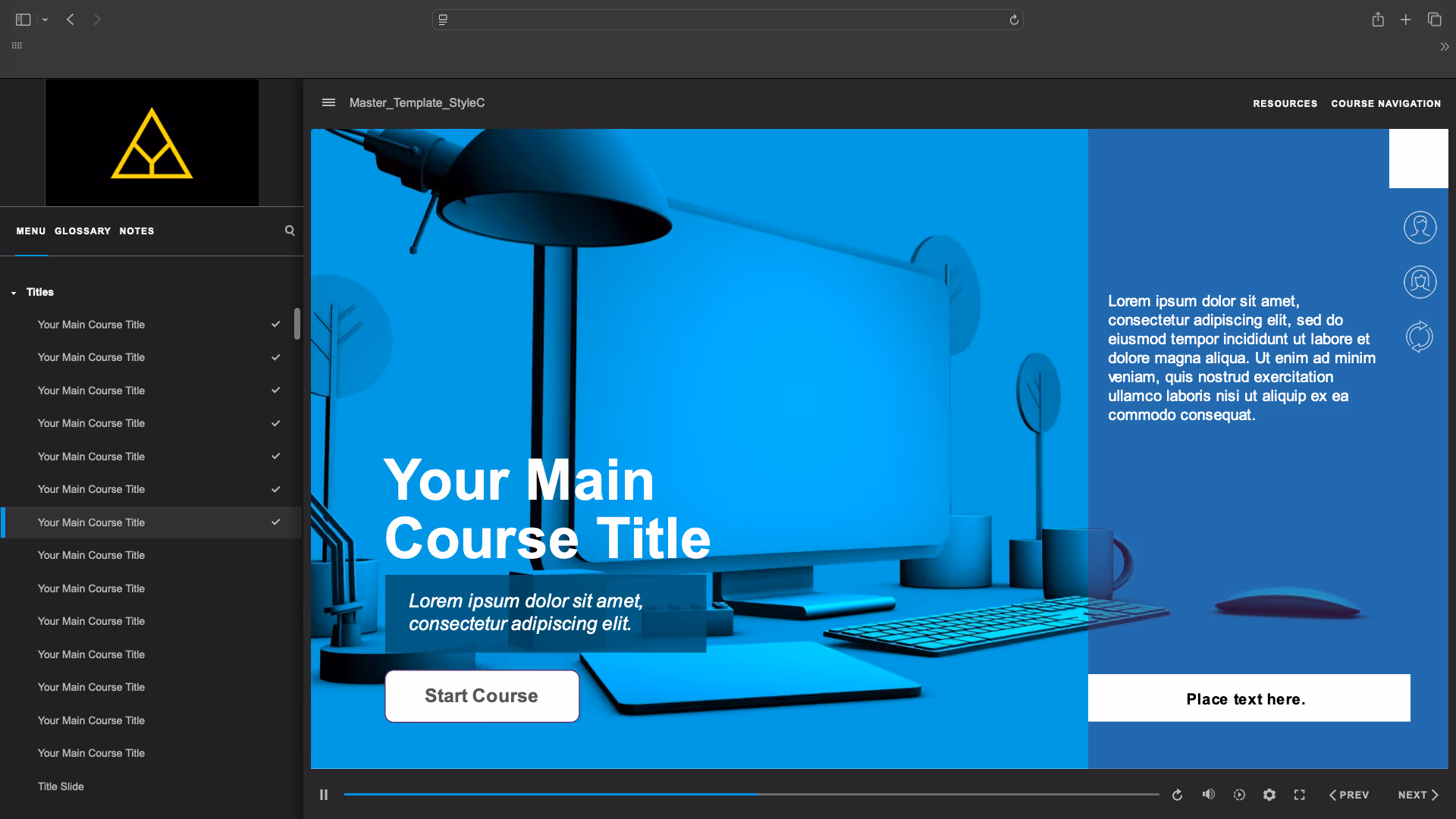 Crie um sistema de modelos de nĂvel profissional, pronto para HTML5, que permita a criação rápida e escalável de conteĂşdo para designers instrucionais, mantendo a acessibilidade, a flexibilidade e um padrĂŁo de design visual limpo.
